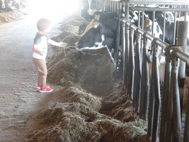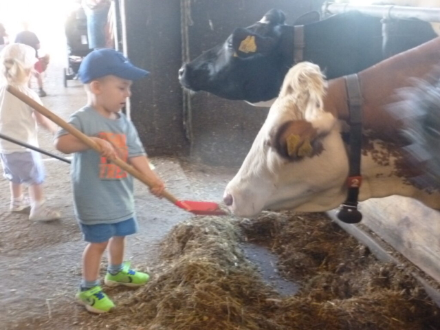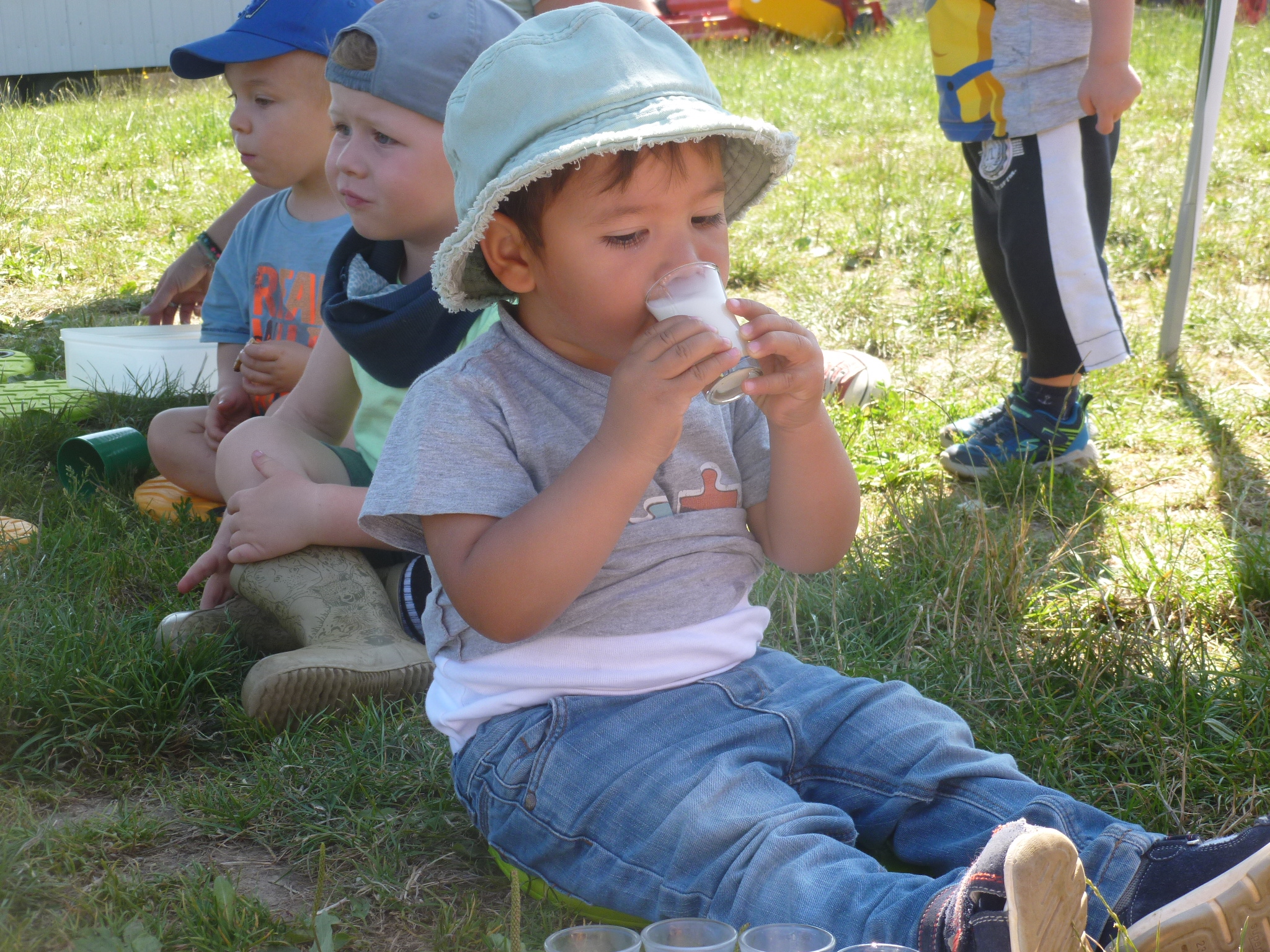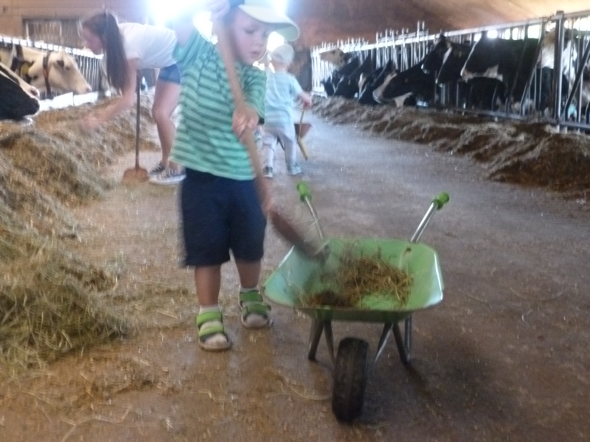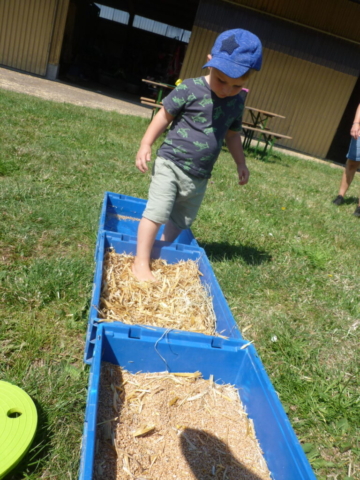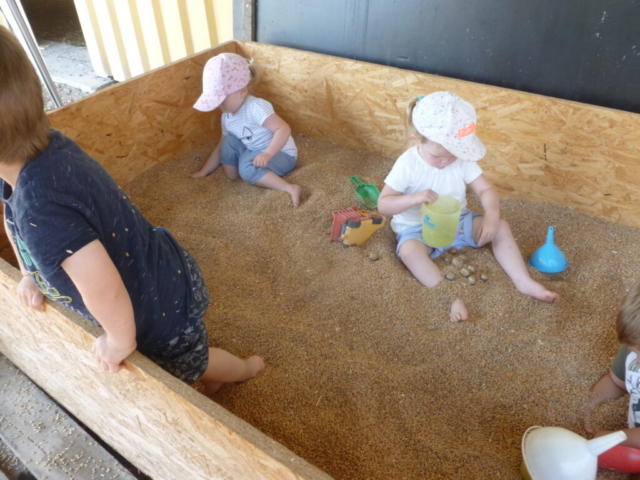Die Kinder fütterten die Kühe und die Hühner, halfen Stroh aufladen, entspannten im Getreidebad und auf der “Fühlstraße”.